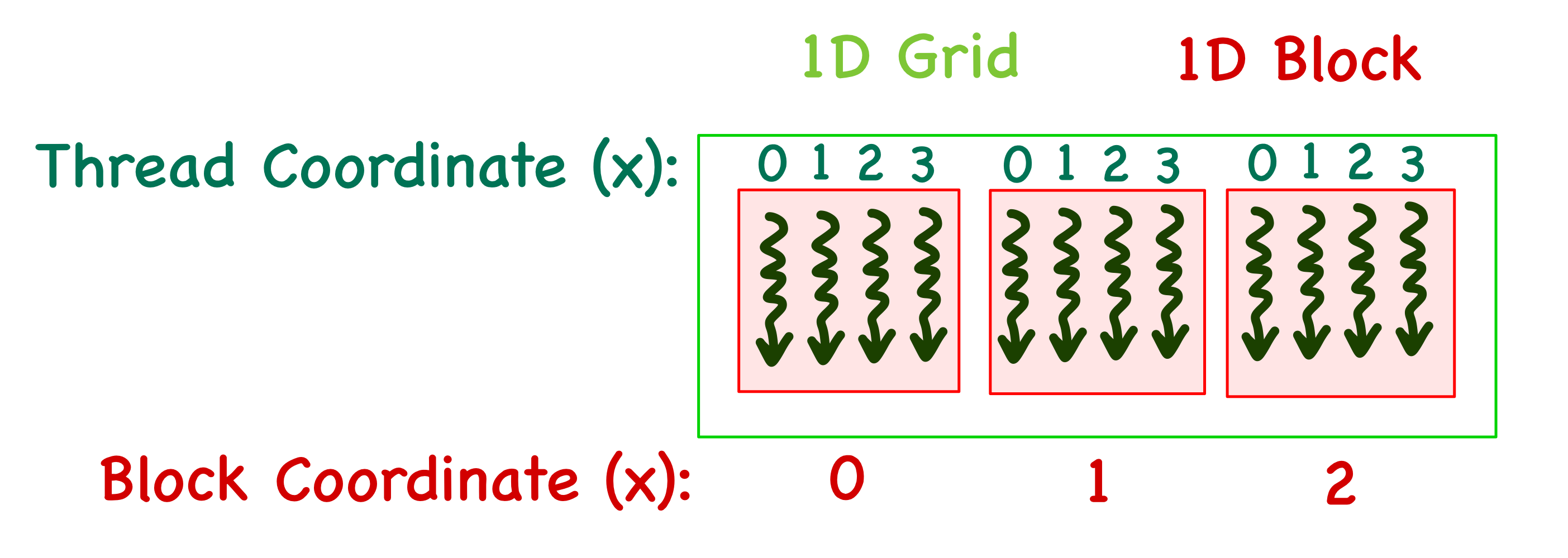 - The 1D case is the simplest, with only an \(x\) index. For example, consider a grid with 3 blocks and 4 threads in each block. The blocks will then have \(x\) coordinates ranging from \(0\) to \(2\) and threads in each block will have \(x\) coordinates ranging from \(0\) to \(3\). It is important to note that the thread index is local for each block.