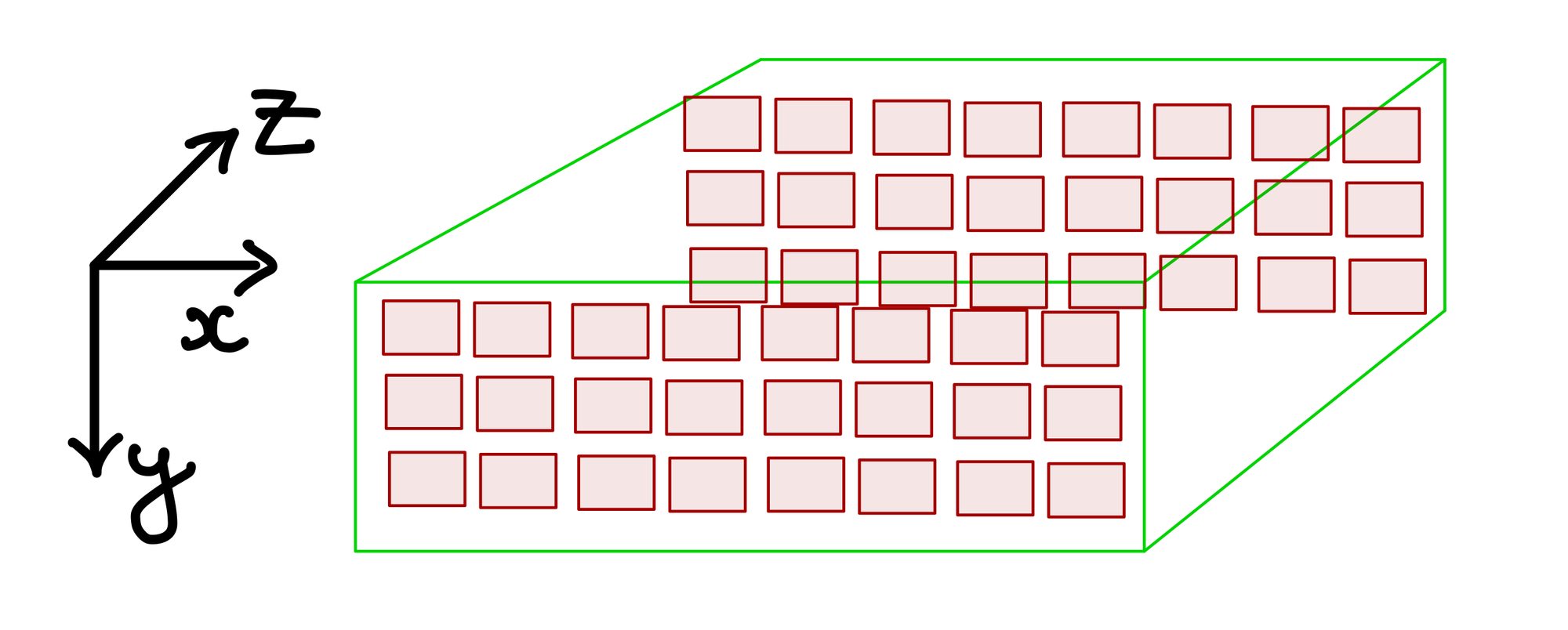 Now, who decides which thread works on which element of the matrix \(C\)? We need to understand how threads are organized on a GPU to answer this question. When the kernel function is called, it creates a grid of threads on the GPU. The grid is subdivided into multiple blocks, each containing the same amount of threads. The blocks in a grid and threads in a block can be arranged in a 1D/2D/3D manner with coordinates \(x,y,z\) assigned to the blocks and the threads inside each block.