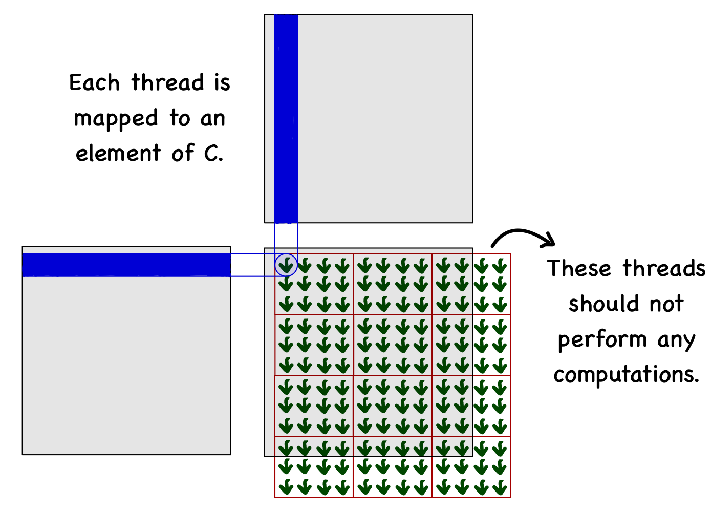 sq_mat_mul_kernel<<<dim_grid, dim_block>>>(d_A, d_B, d_C, N);An important thing to remember is that each thread executes the same kernel function. So, the first thing to do is identify the thread-to-element (of the matrix C) mapping, i.e., which element of C this thread will work on. It is done using CUDA variables: