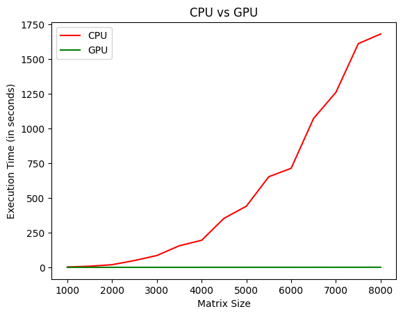 I compared the execution time for matrix multiplication on a CPU (Ryzen 7 7700) against a GPU (RTX 3090). The size of the matrices varied from 1000 to 8000, and the GPU provided a speedup of 2678% in the case of 8000!