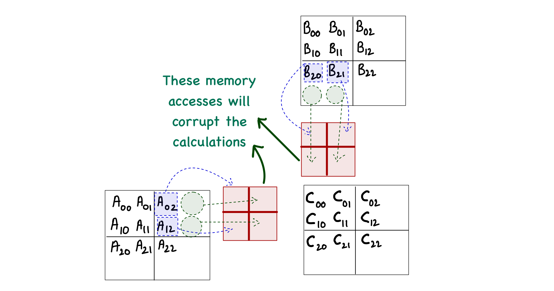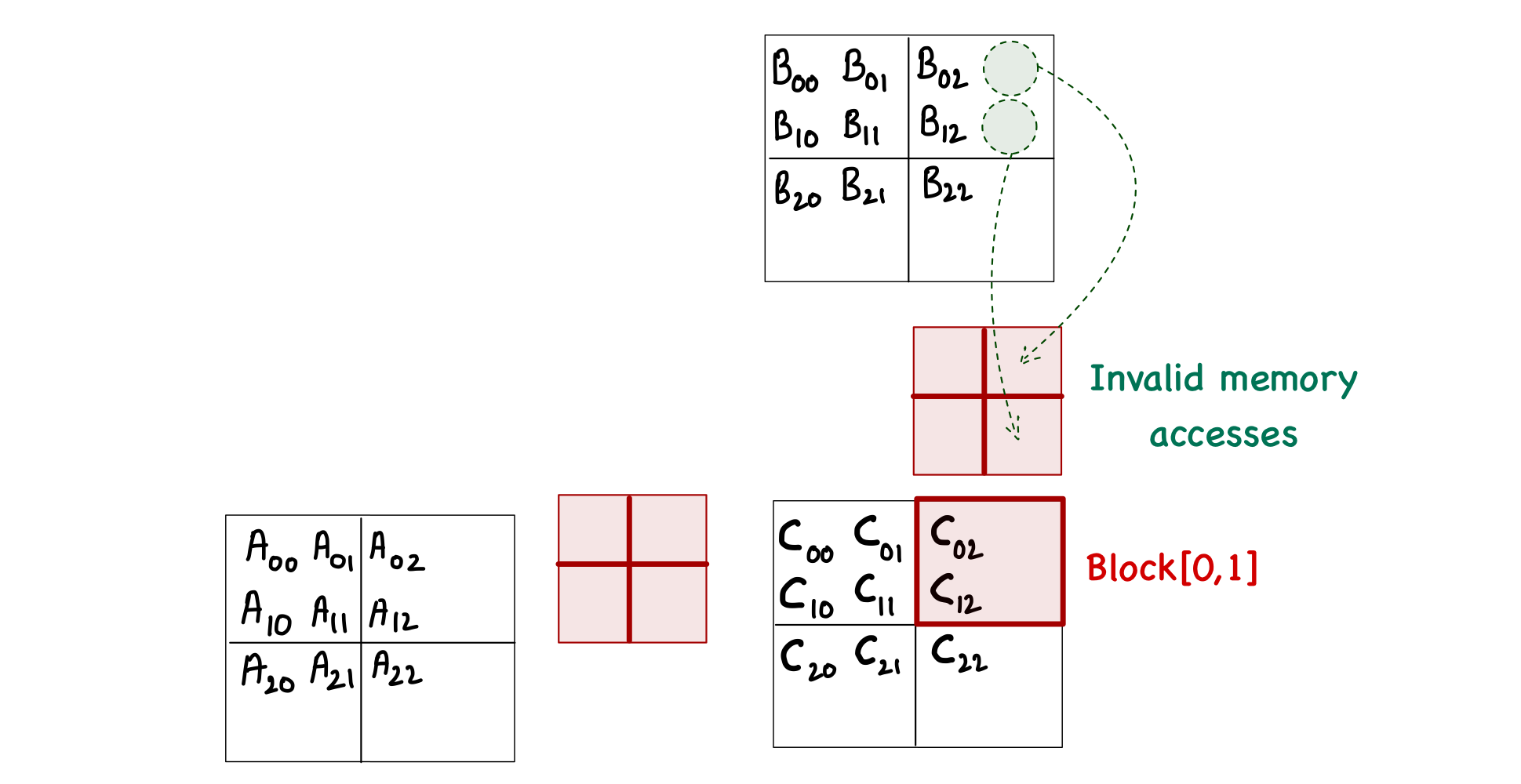 Starting with the case when the matrix size is not fully divisible by the tile size. Consider a matrix multiplication involving 3 x 3 matrices (and the tile size is 2). One problem in this case would arise during phase 1 of computing the block[0,0], when the threads will attempt to load elements \(A_{0,2}\), \(A_{1,2}\), \(B_{2,0}\), and \(B_{2,1}\).