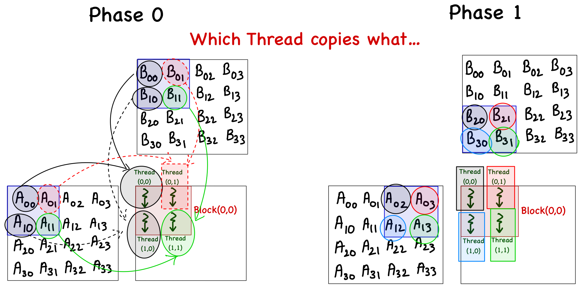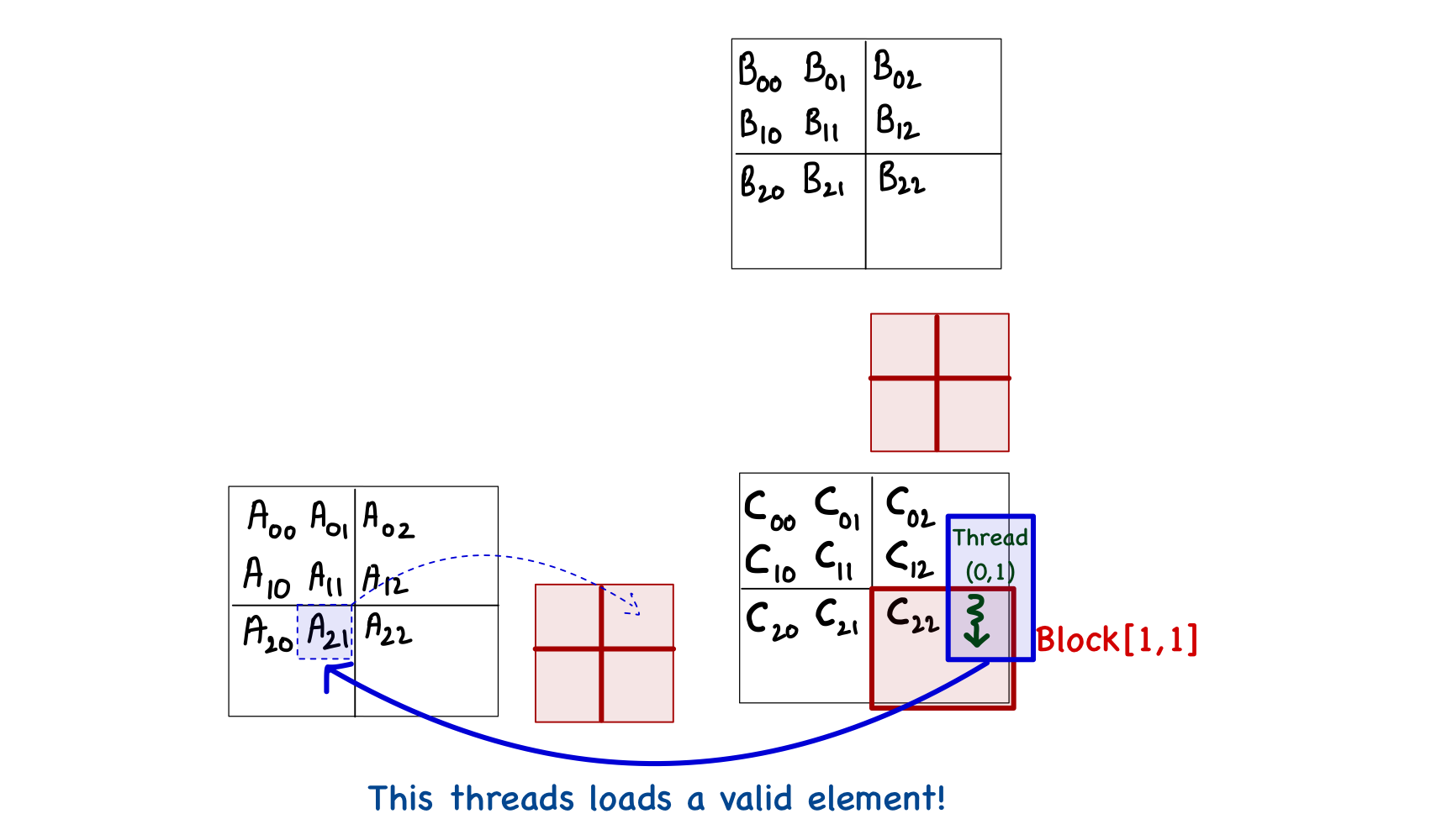 Another thought might occur to simply exclude the threads that are outside the bounds of matrix C. This is also untrue, as the thread[0,1] in block[1,1] is not computing any C element but will load \(A_{2,1}\) during phase 0.