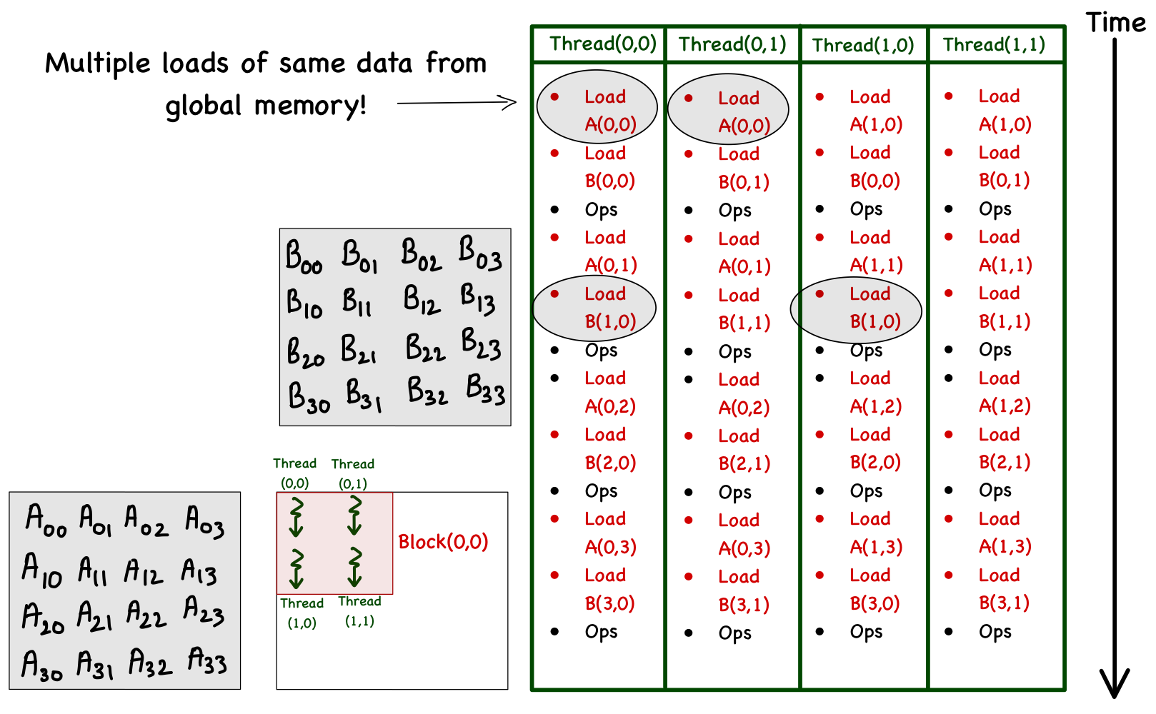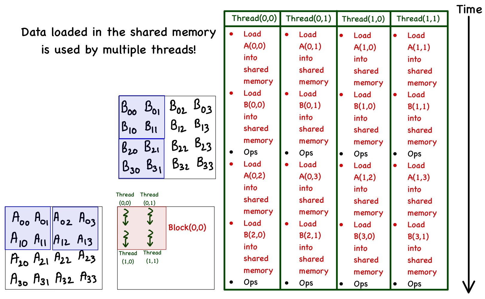 | Thread[1,0] | Load A[1,0] | Load B[0,0] | C[1,0]+=A[1,0]*B[0,0] | Load A[1,1] | Load B[1,0] | C[1,0]+=A[1,1]*B[1,0] | Load A[1,2] | Load B[2,0] | C[1,0]+=A[1,2]*B[2,0] | Load A[1,3] | Load B[3,0] | C[1,0]+=A[1,3]*B[3,0] |