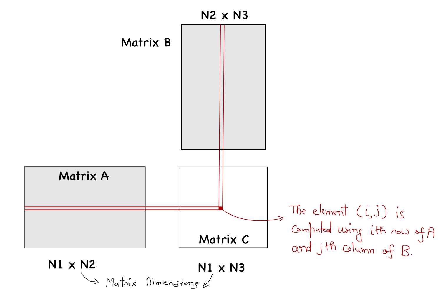 }Finally, accommodating rectangular matrices is an easy modification. The kernel function will accept three integers representing the dimension of the three matrices (details shown in figure below), and then we replace N with those values appropriately (as shown in the code snippet below).