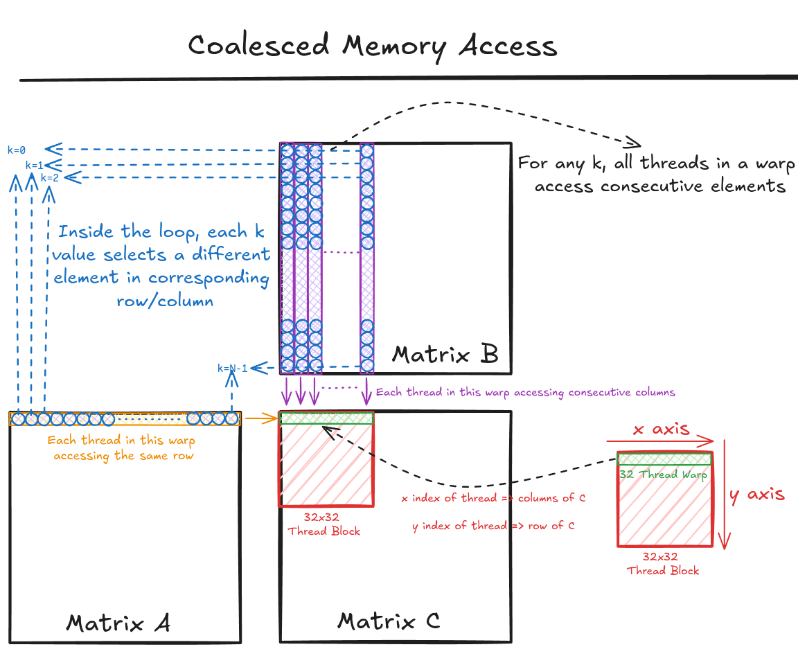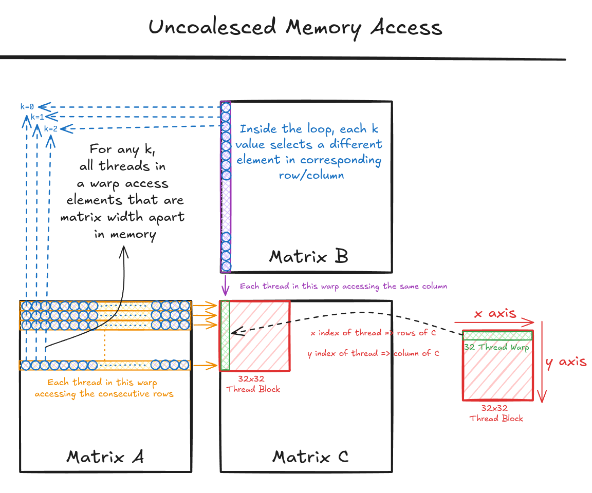 I compared the runtime for the two implementations, and the former (Code Snippet 1 and Figure 1) ran 4.5x faster for the matrices of size 8000! To understand why this is happening, we must understand how global memory works and implement an important technique called Memory Coalescing.