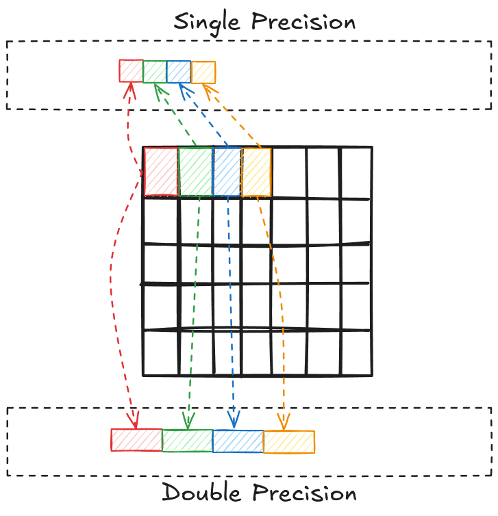 A step further, we have half-precision (2 Bytes) floating point numbers. These are not natively supported in standard C++. However, CUDA has an option to use half-precision (declared as half) and this is where Tensor cores operate.
