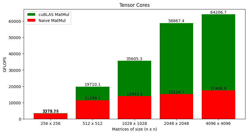 It's not ideal to compare CUDA cores to tensor cores, and the tiled version is not optimal. But so is the version using tensor cores. Figure 7 shows the cuBLAS matrix multiplication against the naive version that I've written.