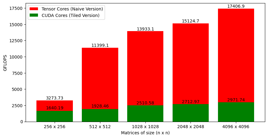 Figure 6 shows the GFLOPS for the tiled version that uses CUDA cores against the naive version that uses tensor cores. The jump in performance is massive (especially for large matrices)!